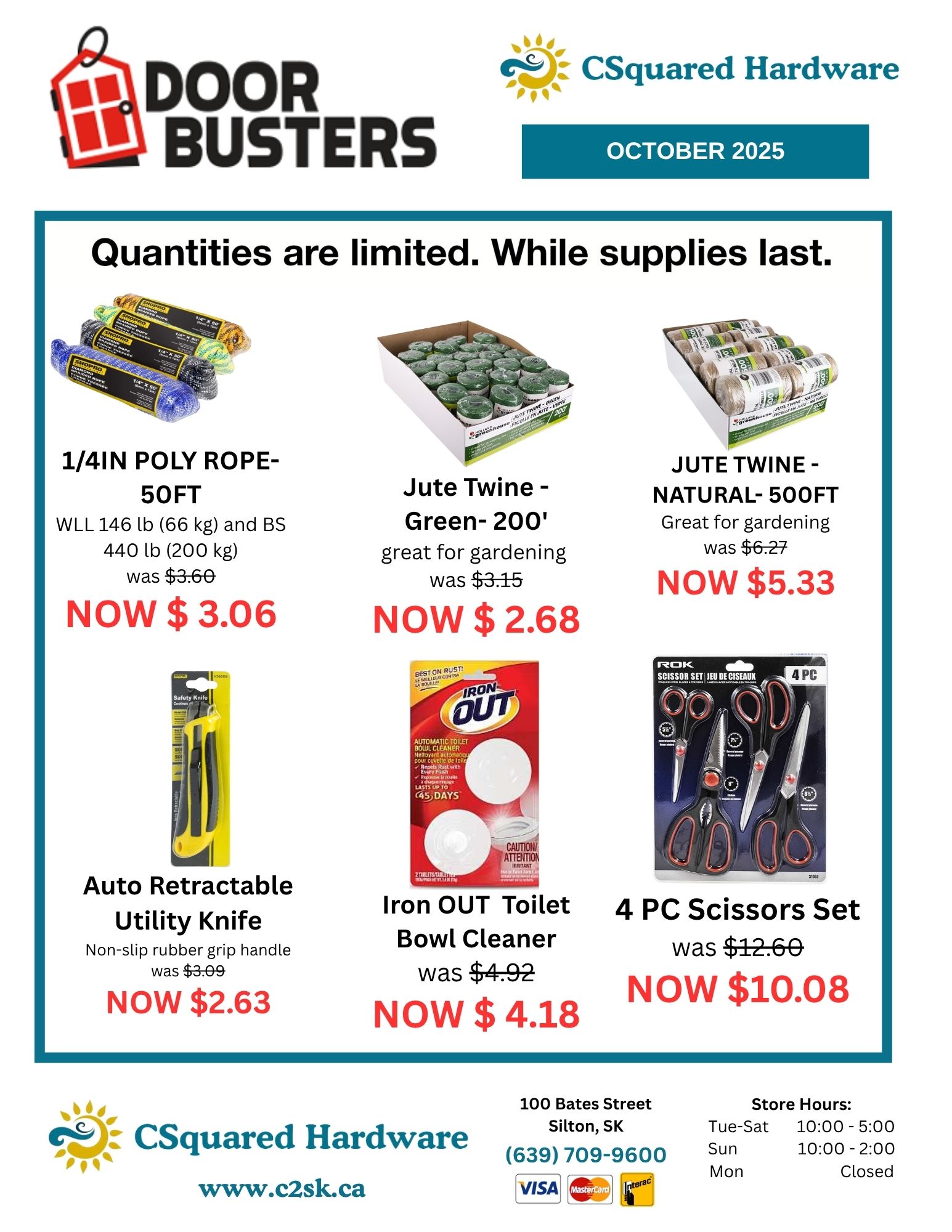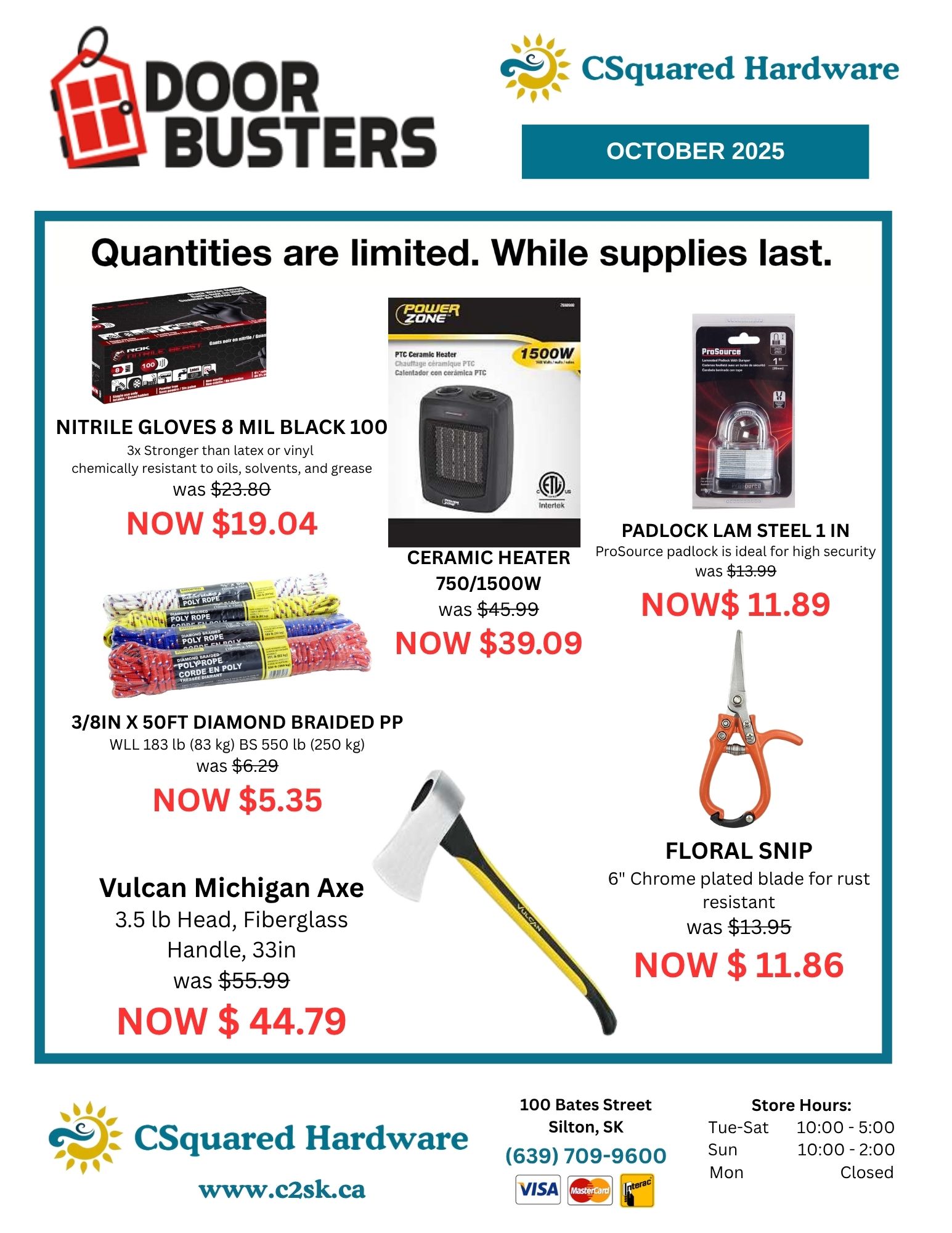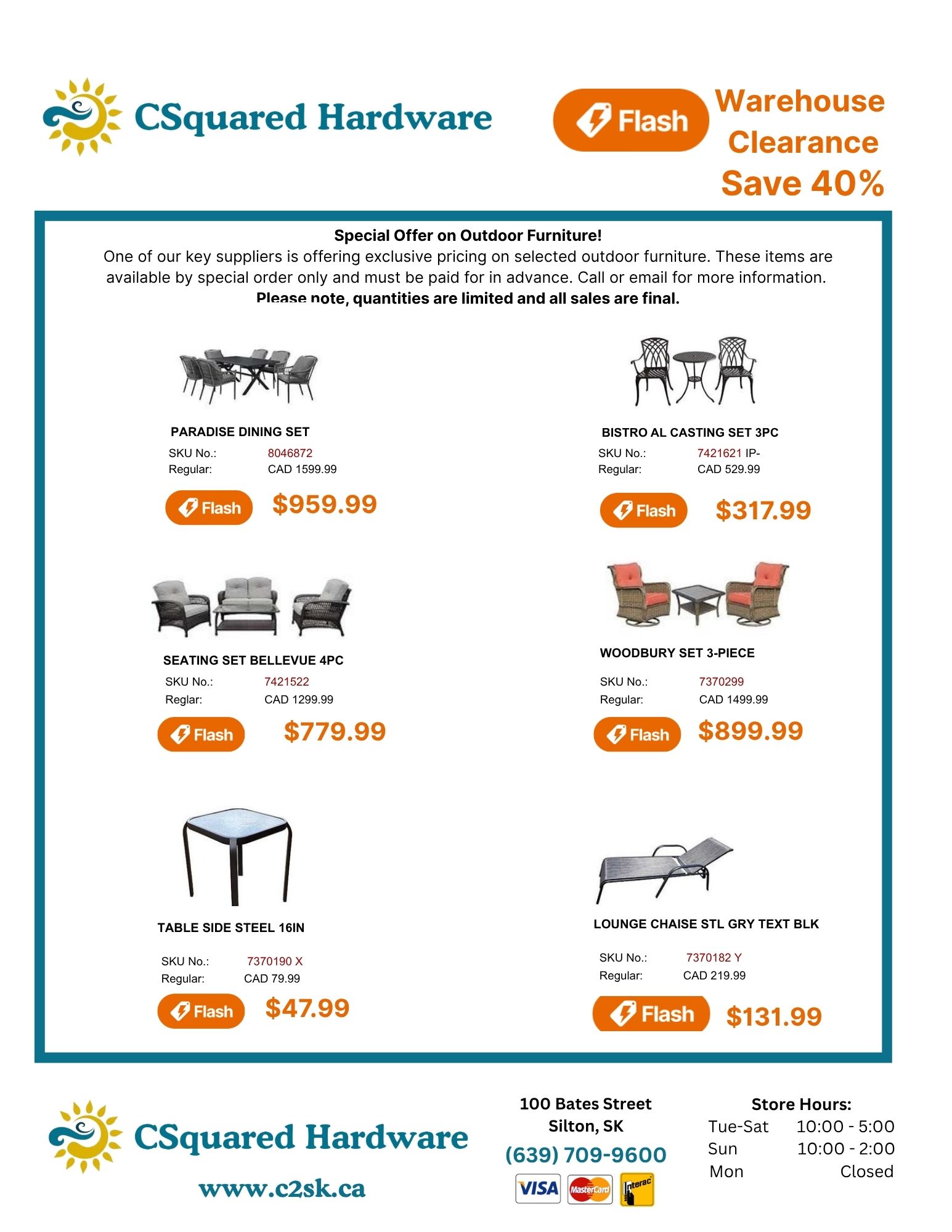 We have been in CSquared Hardware quite a few times since itβs opened and the store is clean inside and out. It has pretty much everything and the prices are affordable. In the past we have had to run back and forth to the city when doing Renoβs on our cabin and we are so happy that this store is close by we will continue to support this business in the future.